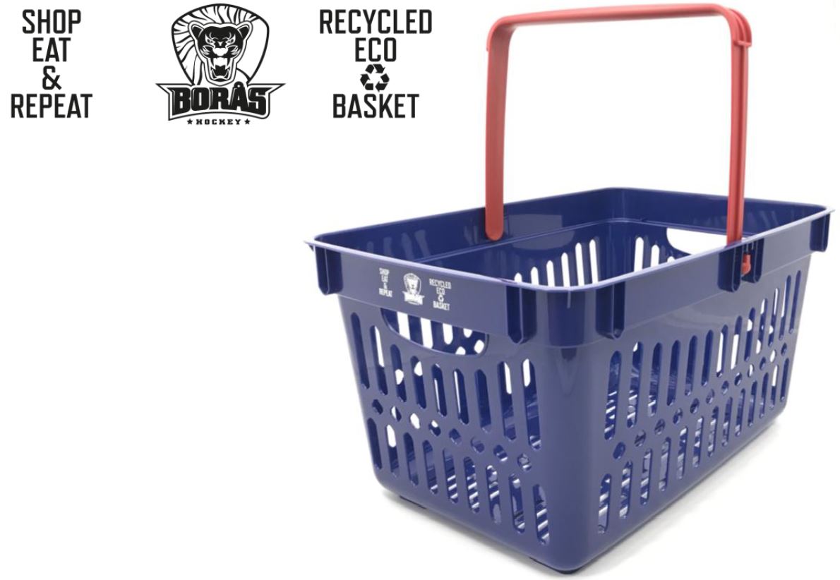 Borås Hockey populär kundkorg. Ett perfekt hjälpmedel som underlättar vardagen när du handlar eller röjer på jobbet, i lägenheten, hemmet eller i garaget. Du visar vilken klubb du stöttar, och du på flera sätt bidrar till att begränsa uppvärmningen, och gör ett bidrag till att nå internationella målet om 1,5 grader! Korgen produceras i Småland, med och av Smålänningar. Nordiska Plast strimmar och optimerar konstant sin fabrik för att producera klimatsmarta produkter. Råmaterialet kommer från återanvänt material i kombination med EU, el och energi användning från grön energi och egen energiproduktion! Och om du själv väljer att ta med dig en egen korg behöver du inte köpa påse på plats!